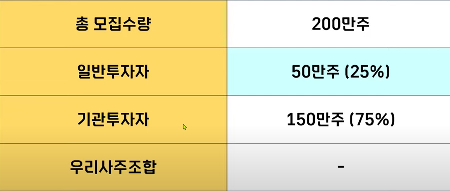 자 그럼 청약정보 체크를 하면서 조금 더 살펴보겠습니다 총 200만 주를 모집하는데요 일반 투자자에게 50만 주 그리고 기관투자자는 150만 주를 받아갑니다. 청약 주관사는 세 곳인데 NH투자증권 하나증권이 메인 주관사입니다. 각 20만 주씩 배정이 되어 있고요 일반고객 청약한 돈은 NH가 8000주 한화증권은 만주입니다.