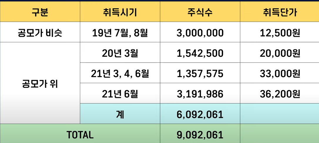 바로 워밍업에서 제가 흥미로운 부분이라고 말씀드렸던 기존 주주들의 취득 가격인데요이 종목은 상장하기 전에 투자를 굉장히 잘 받았는데 일단은 공모 가격이 13,000원 이잖아요이 공모 가격보다 높은 가격으로 취득을 했던 주식수가 약 609만 주입니다 여기에 154만 주는 2만 취득을 했고 여기 136만 주는 33,000원 그리고 마지막으로 투자를 했던 319만 주는 36,200원에 취득을 했습니다.