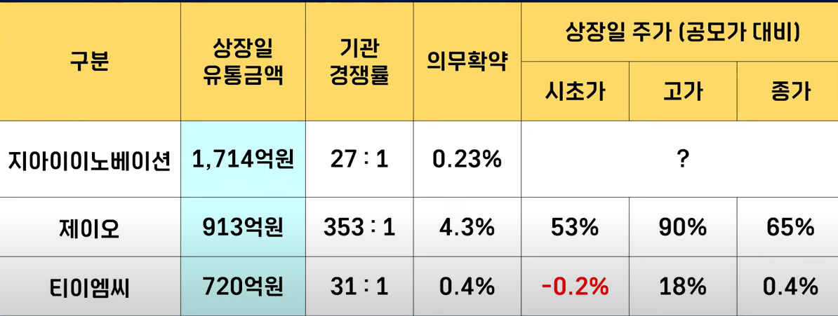 그동안의 사이즈가 크다고 말씀을 드렸던 제이오가 913억 원 티이엠씨가 720원이었으니까요.. 지아이는 이들 종목보다 유통금액도 2배 이상 큰 조건으로 상장하게 되었습니다. 물론 유통금액이 컸던 제이오도 수익을 주었고 티이엠씨도 상장이라는 수익을 주었지만요 지하 이노베이션이 수익을 준다는 보장은 없죠 그래서 유통물량과 유통금액이 매우 크다는 점은 저는이 종목의 최대 단점으로 꼽고 싶습니다.