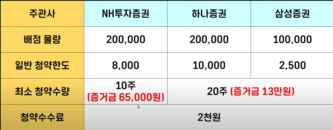 그리고 삼성증권은 서브 주관사인데 10만 주가 배정되었고요 일반고객의 청약한 도는 세증권사 중에 가장 적은 2500주입니다. 그리고 최소 청약수량이 다른데 nh투자증권은 10주부터입니다/ 그래서 10주만 청약하겠다면 증거금이 6만 5천 원이 필요하고요 한화증권과 삼성증권은 20주부터이니까 증거금은 13만 원부터 필요하겠습니다.