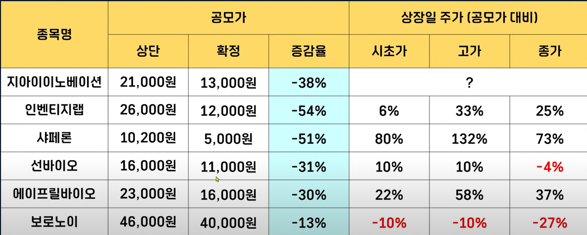 비슷하게 30% 정도 낮아진 종목이 선바이오와 에이프릴 바이오가 있었는데 에이프릴 바이오는 수익을 주었지만 번바이오는 종가 기준으로 손실을 주었습니다. 그리고 표를 보면 이렇게 상단 공모 가격 기준으로 -50% 정도 낮아진 종목들은 상장일에 좋은 수익을 주었거든요 그래서 내신 공모 가격이 조금 더 낮아지길 바라보고 있었는데 여하튼 공모 가격이 약간은 애매하게 정해진 것 아닌가 그런 생각이 듭니다.