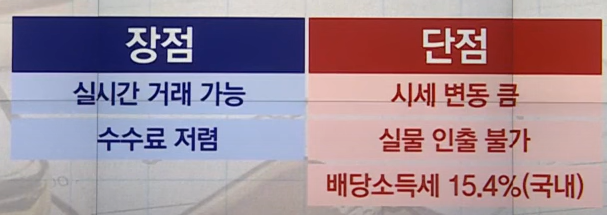 그리고 제가 아까 간접적인 투자라고 말씀을 드렸잖아요 그렇기 때문에 실물 인출은 불가능합니다. 네 하지만 또 수수료는 상대적으로 저렴하기 때문에 이런 장점 단점 명확하게 구분을 하셔서 투자를 하시면 좋겠습니다.