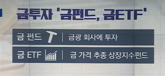 금 펀드 같은 경우에는 금을 캐는 회사라든지 혹은 금광을 갖고 있는 회사에 관련된 펀드에 투자를 하는 방식이고요 그 ETF 같은 경우에는 증권사를 통해서 증권 계좌를 열잖아요 이때 그 ETF를 매수를 해가지고 거래를 하고 수익을 얻는 방식이라고 보시면 되겠습니다.