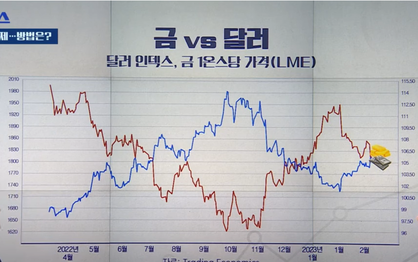 우리는 사실 이게 가장 궁금하잖아요? 금이랑 달러는 경쟁관계에 있습니다. 요즘 같은 경우에는 인플레이션이 좀처럼 꺾이지를 않고 미국 중앙은행에서는 통화 긴축 정책을 생각보다 좀 더 오래 가져갈 것 같습니다.