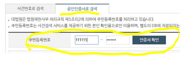 1. 주민등록 번호를 입력하시고 인증서확인을 누르시면 공인인증서창이 뜨게 됩니다. 이후 본인의 공동인증서 선택 후 암호를 입력하면 자신의 사건이 보이게 됩니다.