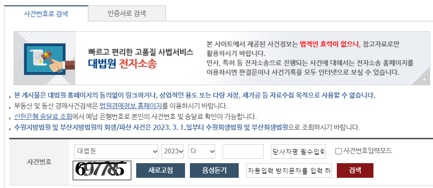 소송이 진행이 되어 사건 번호를 받았을 때 소송이 현재 어떻게 진행이 되고 있는지 알고 싶을 때 사건번호를 입력해서 나의 사건을 조회하실 수 있습니다.