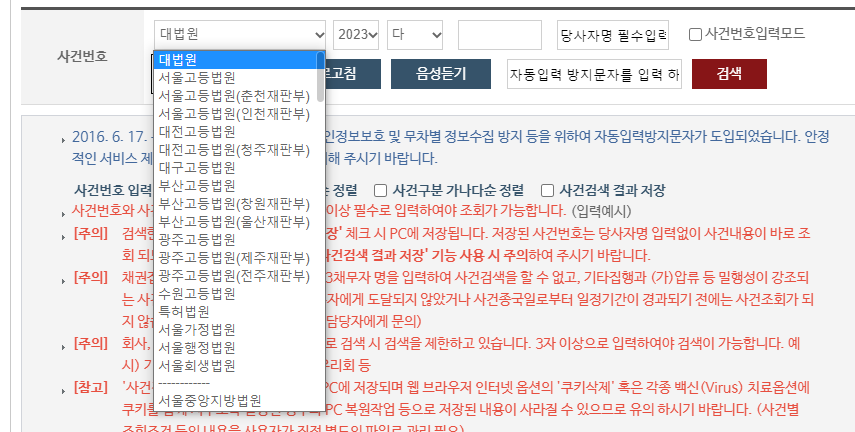 1. 먼저 해당 법원을 선택합니다. 기본적으로 대법원으로 되어 있으나 옆의 화살표를 클릭하면 각 지방 법원의 명단이 다 나오게 됩니다.