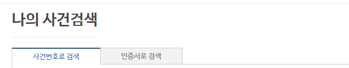 1. 시건번호로 검색 2. 공인인증서로 검색 사건 번호를 알고 계시면 사건번호로 검색을 클릭, 사건 번호를 모르시면 인증서로 검색을 클릭합니다. 사이트에 접속하시면 기본적으로는 사건번호 검색으로 되어 있습니다.