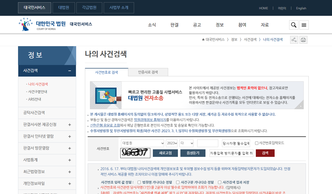 대한민국은 법원 및 각급 법원 홈페이지에서 사건검색과 공고, 판결서 인터넷 열람등의 업무가 가능합니다.