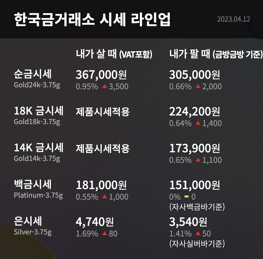 내가 살 때 (VAT포함) 내가 팔 때 (금방금방 기준) 순금시세 살 때 367,000 원 팔 때 305,000 원 18K 금시세 제품시세적용 팔때 224,200 원 14K 금시세 살때 시세적용 팔때 173,900 백금시세 살때 181,000 팔때 151,000 원 기록하고 있습니다.