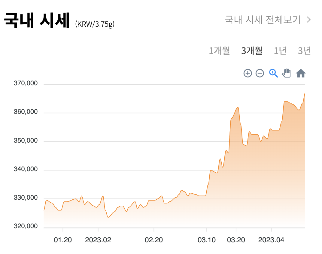 지난 10일 기준 KRX(한국증권선물거래소) 금시장에서 1㎏ 금 현물은 한 달 전보다 8.45% 오른 1g당 8만 4829원을 기록했다고 하네요. 금 값은 최근 미국 및 유럽발 뱅크런등 금융 불안에 따라 안전자산 선호 심리가 확산되면서 사상 최고 수준을 기록하고 있습니다.