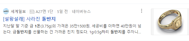 최근 돌반지가 사라지고 있다고 합니다. 돌반지 한돈에 40만 원에 육박하고 있기 때문인데요.. 돌반지를 구매하려 금은방을 찾은 소비자들이 깜짝 놀란다고 하네요.. 그래서 의미 있는 돌반지 선물을 준비하시는 분들께 무게를 4분의 1로 줄인 1g 미니 돌 잔지 가격도 알려 드리도록 하겠습니다. 업계는 당분간은 금값이 계속 오를 거라고 보고 있다고 합니다.