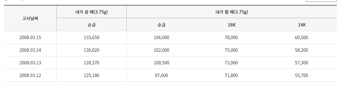 위 고시 가격은 2008년 금값과 현재의 금값 비교표입니다. 정말 가격이 말도 안 되게 올랐지요.. 만일 저 때 금에 투자를 해 놓으셨다면 지금쯤 돈 걱정 안 하시고 계실 겁니다. 그래서 금투자는 단기보다는 장기로 꾸준히 하시기를 추천드리며 아래 포스팅에 금투자 방법 일반일도 쉽게 할 수 있는 5가지 방법 정리 하였으니 읽어 보시기 바랍니다.