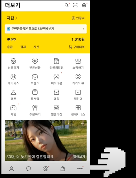 카카오톡으로 이렇게 신청하시면 되는데요 먼저 카카오톡 앱에 접속합니다 그다음 오른쪽 하단 제일 아래 부분에 점 3개가 있습니다.