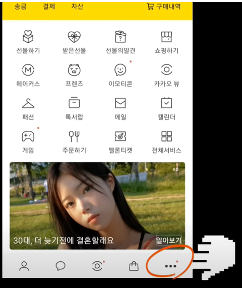 카카오톡으로 이렇게 신청하시면 되는데요 먼저 카카오톡 앱에 접속합니다 그다음 오른쪽 하단 제일 아래 부분에 점 3개가 있습니다.