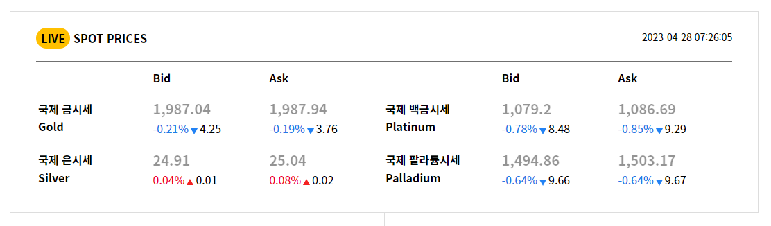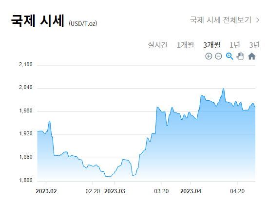 시장은 5월 2~3일 회의에서 미국 중앙은행이 금리를 25 베이시스 포인트 인상할 가능성이 4분의 3으로 보고 있습니다. 미국 금융위기가 전개되면서 안전금 가격은 4월 중순 2,048.71달러로 사상 최고치를 기록했습니다. 이날 은 현물도 온스당 24.8달러로 약 1% 하락한 반면, 백금은 1,088.50달러로 0.2% 상승했고, 팔라듐도 1,511.23달러로 1.9% 올랐습니다..