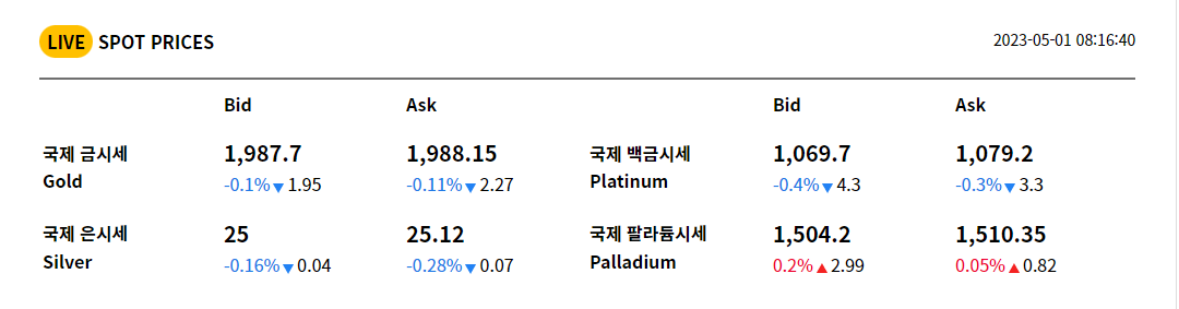 독립 분석가 로스 노먼은 고금리는 어떠한 수익도 제공하지 않기 때문에 금에 불리하게 작용하지만, 또 다른 은행 위기의 가능성을 높이기 때문에 금에 유리하게 작용할 수 있다고 말하였습니다. 금융 위기가 터지면서 4월 중순 불리온은 1년 만에 최고치인 2,048.71달러를 기록하였습니다. 은 현물은 온스당 24.91달러로 0.1% 상승한 반면, 백금은 1,079.52달러로 0.9% 하락했고, 팔라듐도 1,494.07달러로 1.2% 내렸습니다.