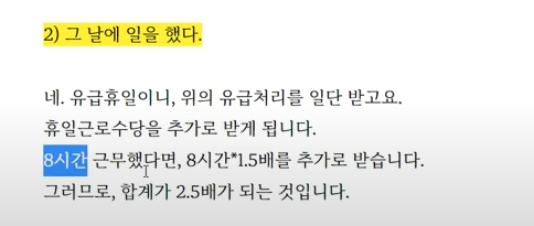 석가탄신일 대체공휴일 (5월 29일) 대체공휴일은 근로기준법상 유급으로 휴일근무수당을 지급해야 합니다. 휴일 수당은 시급에 휴일근로시간을 0.5배 곱해 산출합니다. 8시간 이상 근로자라면 통상임금의 250%를 지급받아야 합니다.
