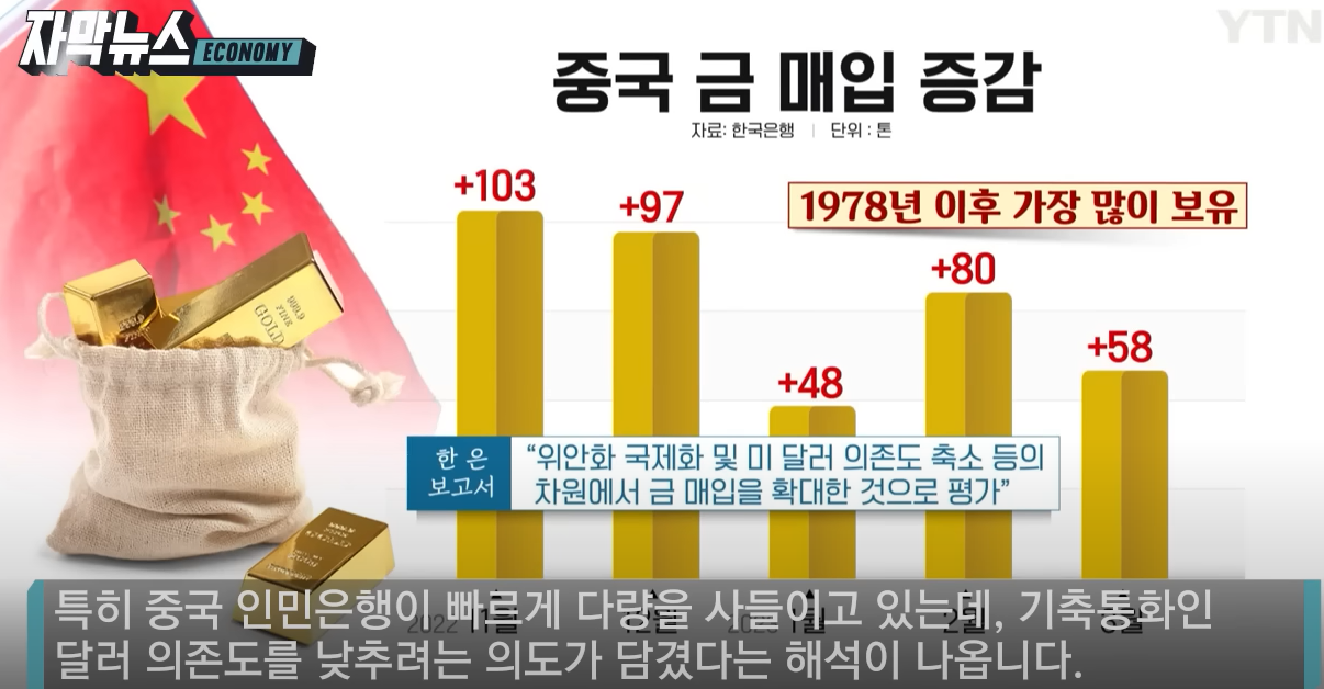 특히 중국 인민은행이 빠르게 다량을 사들이고 있는데, 기축통화인 달러 의존도를 낮추려는 의도가 담겼다는 해석이 나옵니다.
