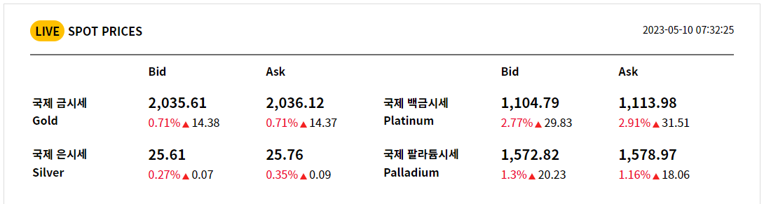 4월 금값은 미국 은행 위기가 안전자산으로 유도하면서 1% 상승했습니다. 은 현물은 25.41달러로 0.1% 오른 반면 백금은 1050.64달러로 1.4% 하락했고, 팔라듐도 1425.68달러로 0.3% 내렸습니다.