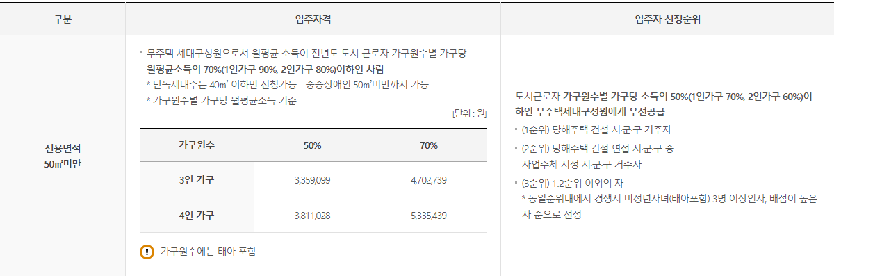 소득기준 전년도 도시근로자 가구원수별 가구당 월평균소득의 70%(1인가구 90%, 2인가구 80%) 이하 2022년 도시근로자 월평균소득(3인기준) : 6,718,198원(70% : 4,702,739원)