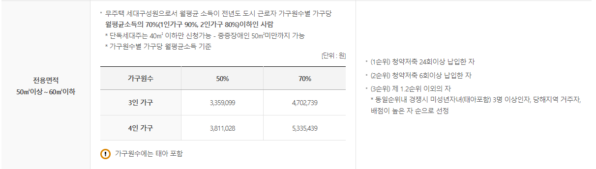 소득기준 전년도 도시근로자 가구원수별 가구당 월평균소득의 70%(1인가구 90%, 2인가구 80%) 이하 2022년 도시근로자 월평균소득(3인기준) : 6,718,198원(70% : 4,702,739원)