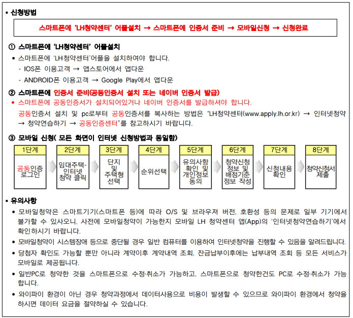 • 예비입주자에 대한 임대차계약 및 입주안내는 등기우편으로 통보해드리니, 당첨 후 주소 및 전화번호 변동이 있을 때 에는 반드시 공사 LH청약센터(예비입주자 개인정보 변경)에서 변경하여야 합니다.