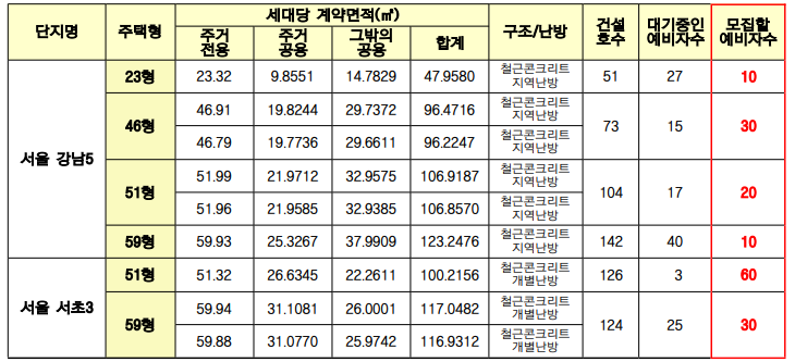 • 단독세대주는 본인의 세대별 주민등록표등본상에 세대구성원이 없는 자를 말하며, 전용면적 40㎡이하 주택만 신청할 수 있습니다. (단독세대주는 강남5단지 23형만 신청할 수 있습니다.)