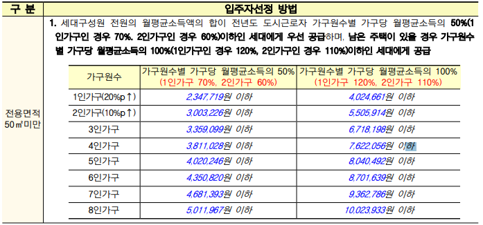 해당 세대의 월평균소득액이 전년도 도시근로자 가구원수별 가구당 월평균소득의 50%(1인가구인 경우 70%. 2인 가구인 경우 60%) 이하인 세대에게 우선 공급하며, 남은 주택이 있을 경우 가구원수별 가구당 월평균소득의 100%(1인가구인 경우 120%, 2인가구인 경우 110%) 이하인 세대에게 공급