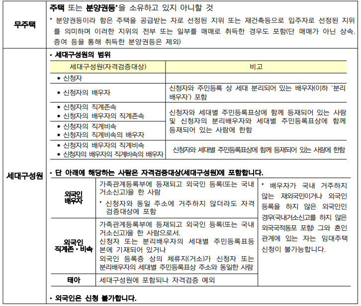 * 위 경우에 해당하여 40㎡초과 주택을 신청하는 경우, 주민등록표등본 구성원은 전원 무주택 요건을 충족하여야 합니다.