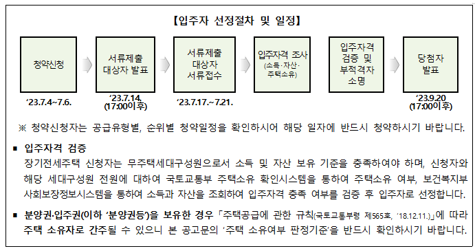 입주자모집공고일(2023.06.20) 현재 무주택세대구성원으로서 아래의 소득 및 자산보유 기준, 그 밖에 법에서 정한 요건 충족 및 입주자격제한(불법양도·전대)에 해당하지 않는 사람 (단, 모집공고일로부터 입주 시까지 무주택세대구성원을 유지해야 하며, 무주택세대구성원을 유지하지 않을 경우 당첨 취소 및 계약거절 등의 불이익을 받을 수 있으니 이점 유의하시기 바랍니다.)