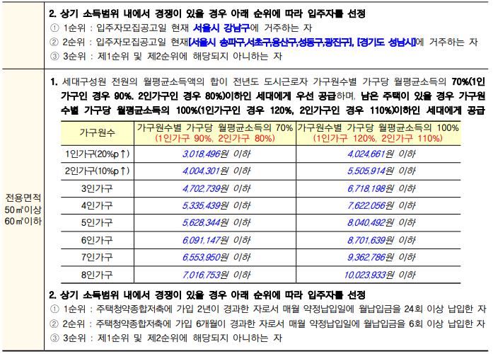 해당 세대의 월평균소득액이 전년도 도시근로자 가구원수별 가구당 월평균소득의 50%(1인가구인 경우 70%. 2인 가구인 경우 60%) 이하인 세대에게 우선 공급하며, 남은 주택이 있을 경우 가구원수별 가구당 월평균소득의 100%(1인가구인 경우 120%, 2인가구인 경우 110%) 이하인 세대에게 공급