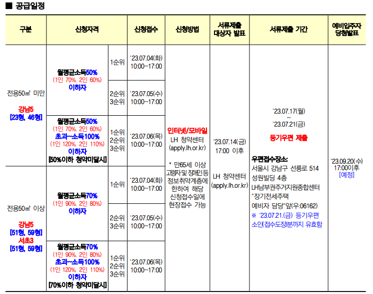 • 단독세대주는 본인의 세대별 주민등록표등본상에 세대구성원이 없는 자를 말하며, 전용면적 40㎡이하 주택만 신청할 수 있습니다. (단독세대주는 강남5단지 23형만 신청할 수 있습니다.)