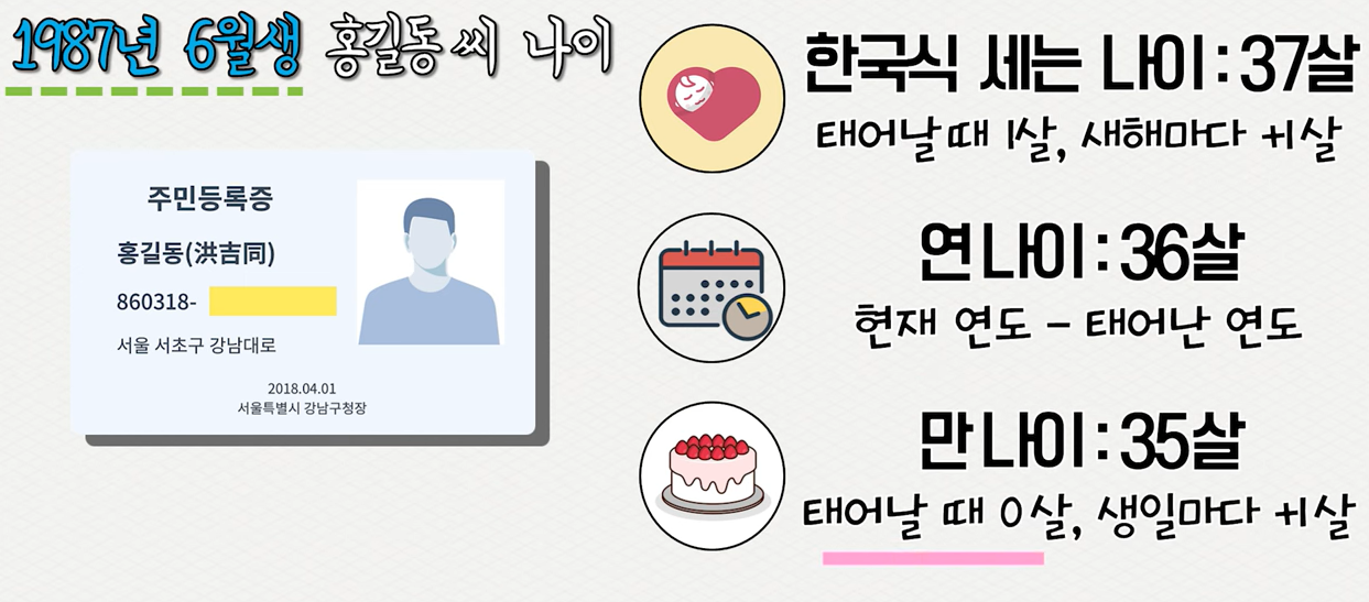 일단 가장 먼저 바뀌는 건 우리 나이가 한 살 또는 두 살 어려집니다. 그래서 오늘 기준으로 자신의 생일이 지나지 않았다 하시는 분들은 만나이 마이너스 한 살 그리고 생일이 지나지 않았기 때문에 -1살 즉 두 살이 어려지게 됩니다.
