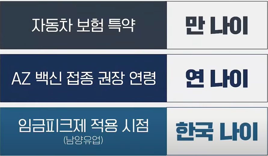 일단 가장 먼저 바뀌는 건 우리 나이가 한 살 또는 두 살 어려집니다. 그래서 오늘 기준으로 자신의 생일이 지나지 않았다 하시는 분들은 만나이 마이너스 한 살 그리고 생일이 지나지 않았기 때문에 -1살 즉 두 살이 어려지게 됩니다.