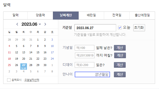 혹시 만나이를 계산하기 좀 어려운 분들은 네이버 검색창에 만나이 계산이라고 검색하면 이런 화면이 나오는데 여기서 출생일에 몇 년생 몇 월 며칠이라고 적고 그 옆 기준일을 오늘로 체크한 다음 계산을 누르면 만 몇 세 무슨 띠입니다라고 나오니까 참고하시면 좋을 것 같습니다.