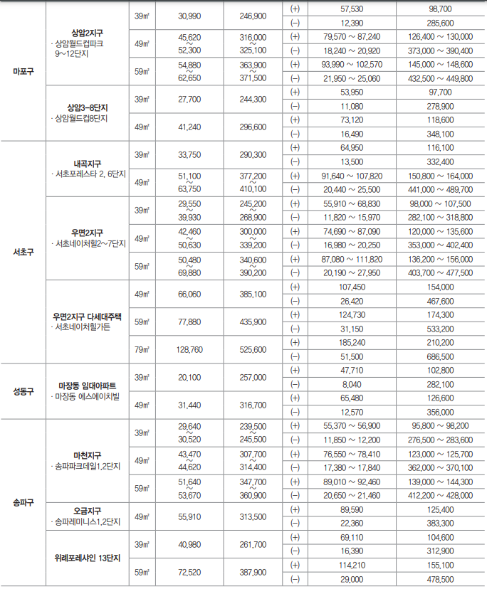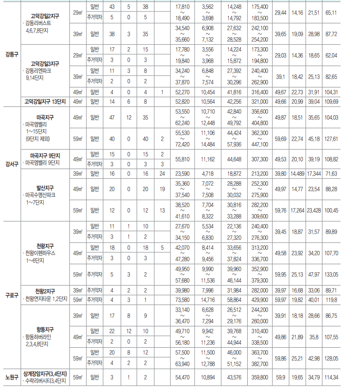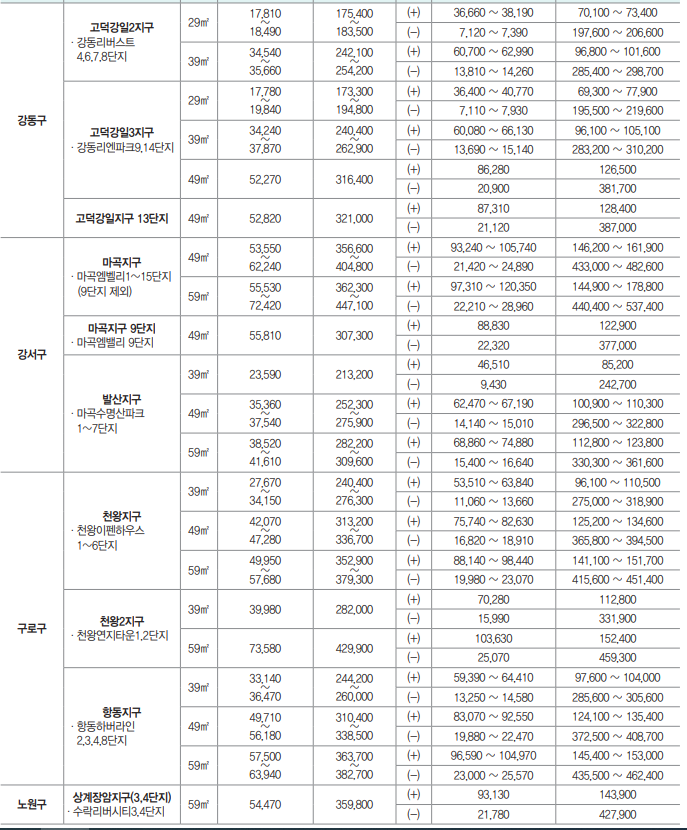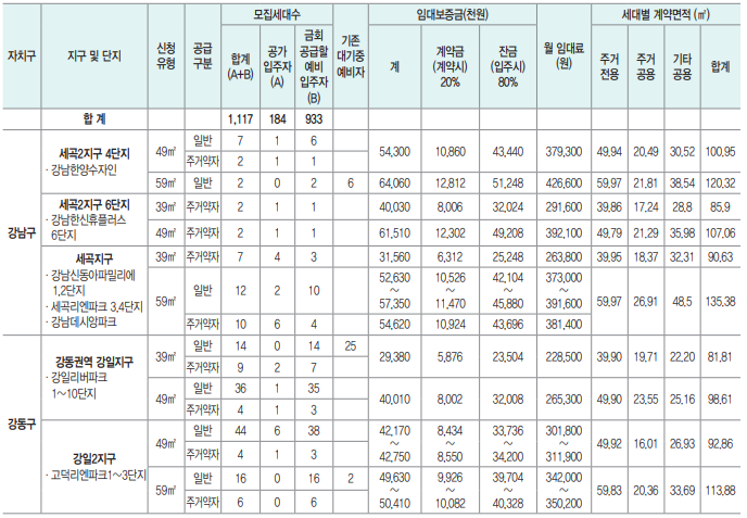 - 세곡지구, 강동권역 강일지구, 강일2지구, 고덕강일2 · 3지구, 마곡지구, 발산지구, 천왕지구, 천왕2지구, 항동지구, 상계장암 지구3,4단지, 상암2지구, 내곡지구, 우면2지구, 마천지구, 오금지구, 신정3지구, 은평1 · 2지구, 신내3지구, 상계장암지구 1,2단지는 단지 구분 없이 지구별, 전용면적별로 신청 접수하여 전산추첨으로 단지와 동호가 결정됩니다.