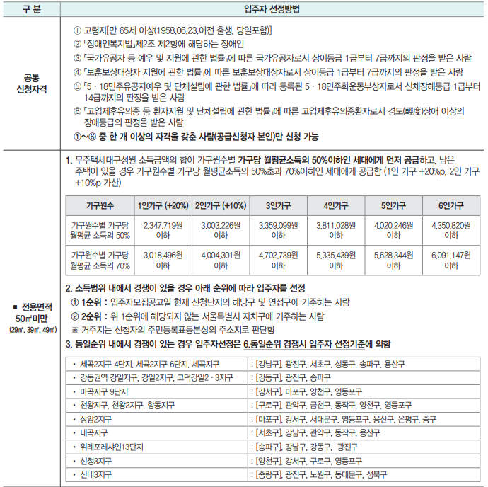 ■ 신청자격은 입주자 모집공고일부터 입주 시까지 계속 유지하고 있어야 하며, 당첨 후 자격요건 상실 시(무주택, 서울시 거주, 소득 및 자산 요건 등) 당첨이 취소되거나 계약이 거절될 수 있습니다