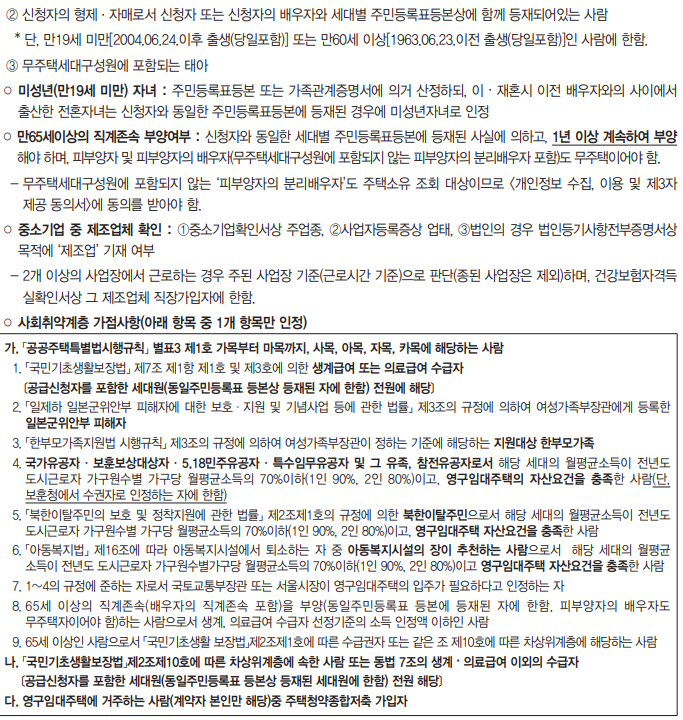 - 주택소유여부, 소득 . 부동산 . 자동차 보유기준, 중복신청 및 중복입주 확인은 무주택세대구성원 전원을 대상으로 합니다.