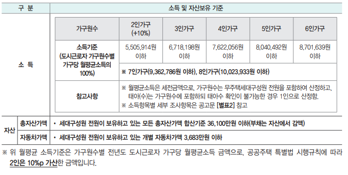 - 주택소유여부, 소득 . 부동산 . 자동차 보유기준, 중복신청 및 중복입주 확인은 무주택세대구성원 전원을 대상으로 합니다.