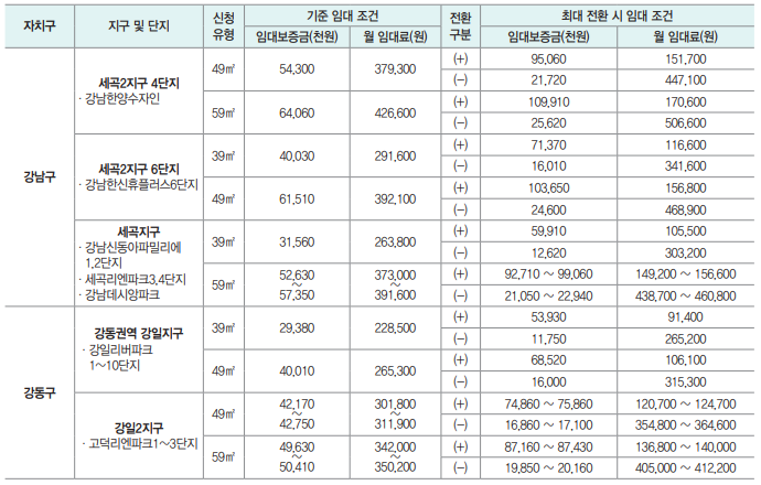 ○ 위 주택면적은 동일지구 또는 동일단지 내 대표적인 1개 타입의 면적으로, 동일단지 내 동일한 신청유형의 임대가격은 동일합니다. 단, 복층이 혼재되어 있는 단지(은평1지구 등)의 경우 별도 가격이 적용될 수 있으며 무작위 전산추첨에 따라 해당 세대가 배정될 수 있습니다.