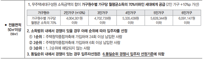 - 세대구성원이 신청자와 등본 상 분리된 배우자, 총 2명인 경우 단독세대주로서 전용면적 40㎡를 초과하는 국민 임대주택의 신청이 불가합니다.