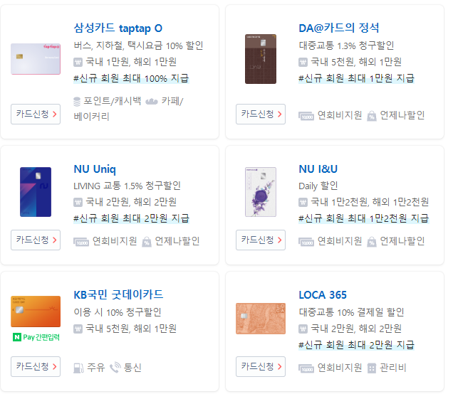 위 6개 카드 이외에도 총 300여개 정도의 카드가 다양한 혜택을 내세우며 출시가 되었습니다. 나머지 카드들을 다 확인 하시려면 아래 링크를 클릭해 확인하시면 됩니다.