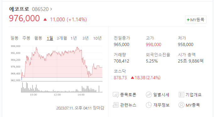 7월 12일 오늘 에코프로, 에코프로비엠, 에코프로에이치엠 3사의 실적 발표를 앞두고 있습니다. 에코프로는 10일 장중 100만 원을 돌파하기도 하였고 11일 976,000 원으로 마감을 하였습니다.