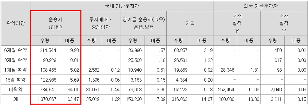 기관투자자 배정 물량은 운용사에서 가장 많이 받아 갔는습니다.137만 주로 전체 물량의 63%를 받았습니다. 나머지를 보면 기타 기관에서 32만 주를 받았고 외국인도 28만 주를 받았습니다. 그래서 기관 배정 물량이 특별한 점은 없었던 종목입니다.