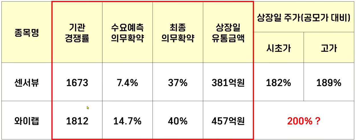 자 그래서 오늘 와이랩도 낙관적으로만 생각하는 것은 경계를 해야 될 것 같은데요 그래도 여기 보시면 수요예측 결과가 센서뷰 보다는 다 좋았습니다. 기관 경쟁률도 높았고 의무확약 비율도 높았습니다.