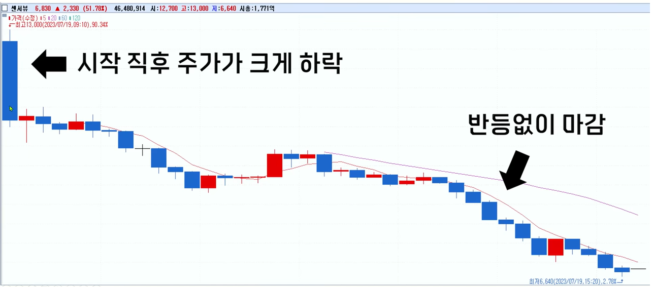 자 그러면 잠시 센서뷰를 한번 보겠습니다. 상장일의 시트 봉 차트로 볼 텐데요 시초 가격은 12,700원으로 시작을 했는데 공모가 대비 182% 상승한 가격으로 시작을 했구요 이후에 약간 더 상승이 나와서 13,000원까지 아주 조금 주가가 올라갔었습니다. 하지만 바로 주가는 11,000원대까지 급하게 하락이 나왔고요 이때 삼성증권 서버가 터지는 바람에 원하는 타이밍에 제대로 매도를 하지 못한 분들이 많이 나왔습니다.