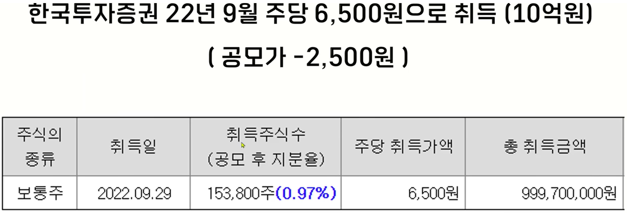그리고 키움증권이나 펄어비스 그리고 개인주주 등이 나머지 물량을 보유를 하고 있는데 이런 기타 법인들도 상장일에는 주식을 꽤 매도할 수 있는 상황입니다. 그리고 참고로 주관사인 한국투자증권은 작년에 프리 ipo로 투자를 했었는데요 작년 9월에 10억원을 투자를 하면서 약 15만 주를 취득을 했고이 당시에 주당 6500원으로 취득을 하였습니다.
