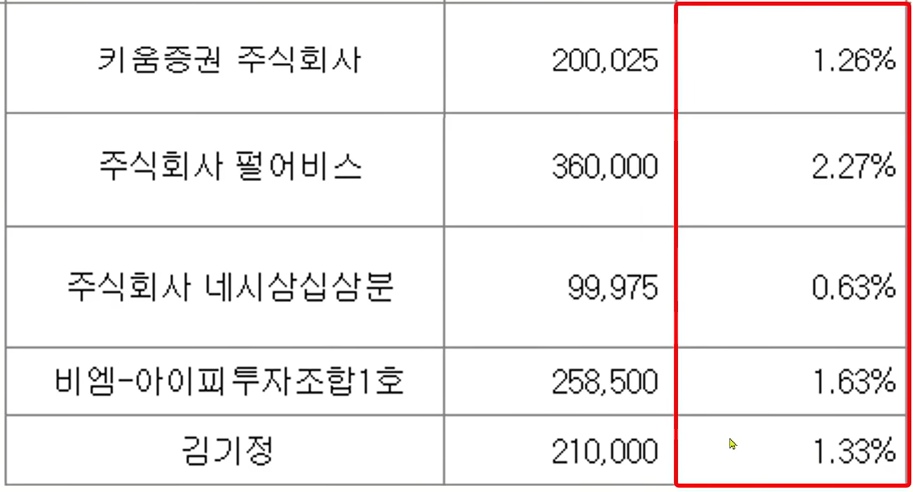 상장일에 매도할 수 있는 기존 주주 물량은 303만 주 정도인데요 공모주주 물량보다는 약 1.5배 정도 많은 상황으로 등장합니다. 기존 주주의 명단을 보면 일단 재무적 투자자가 물량 대부분을 보유하고 있습니다 재무적 투자자 7곳에서 169만 주로 전체 주식의 10.7% 물량을 상장일에 매도할 수 있는 조건입니다. 상장일의 흐름을 잘 만들어 주길 바래 봅니다.