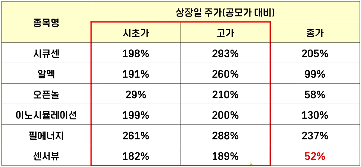 기존의 상장했던 종목들을 보면 오프너를 제외한다면 시초 가격은 다른 종목들에 비해서 10에서 20% 정도 낮게 시작을 했고요 그리고 센서뷰 이전에 다섯 종목 장중에 고가가 모두 200% 이상 상승을 했는데 센서뷰는 189%까지만 상승하고 흘러내렸습니다.